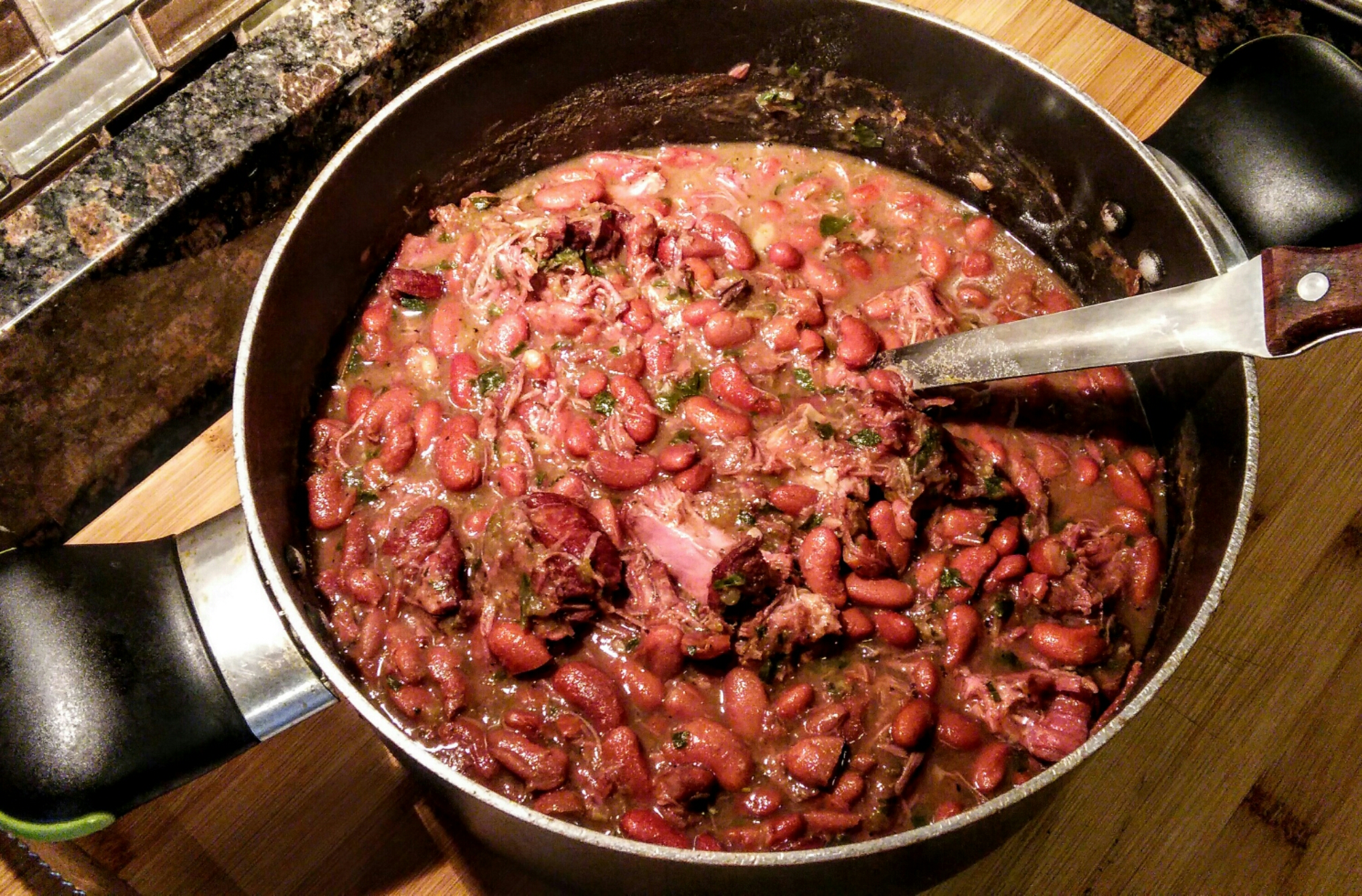 Add pre-washed beans, precooked meat of your choice(I use smoked turkey), Worcestershire sauce, bay leaves and thyme. Cover beans with water. Bring to a boil then reduce heat and cook for 1 – 1.5 hours until beans are soft. Watch water level every 30 minutes or so and add additional 1/4 cup to 1/2 cup water as needed. You want this to be a bit “soupy”.