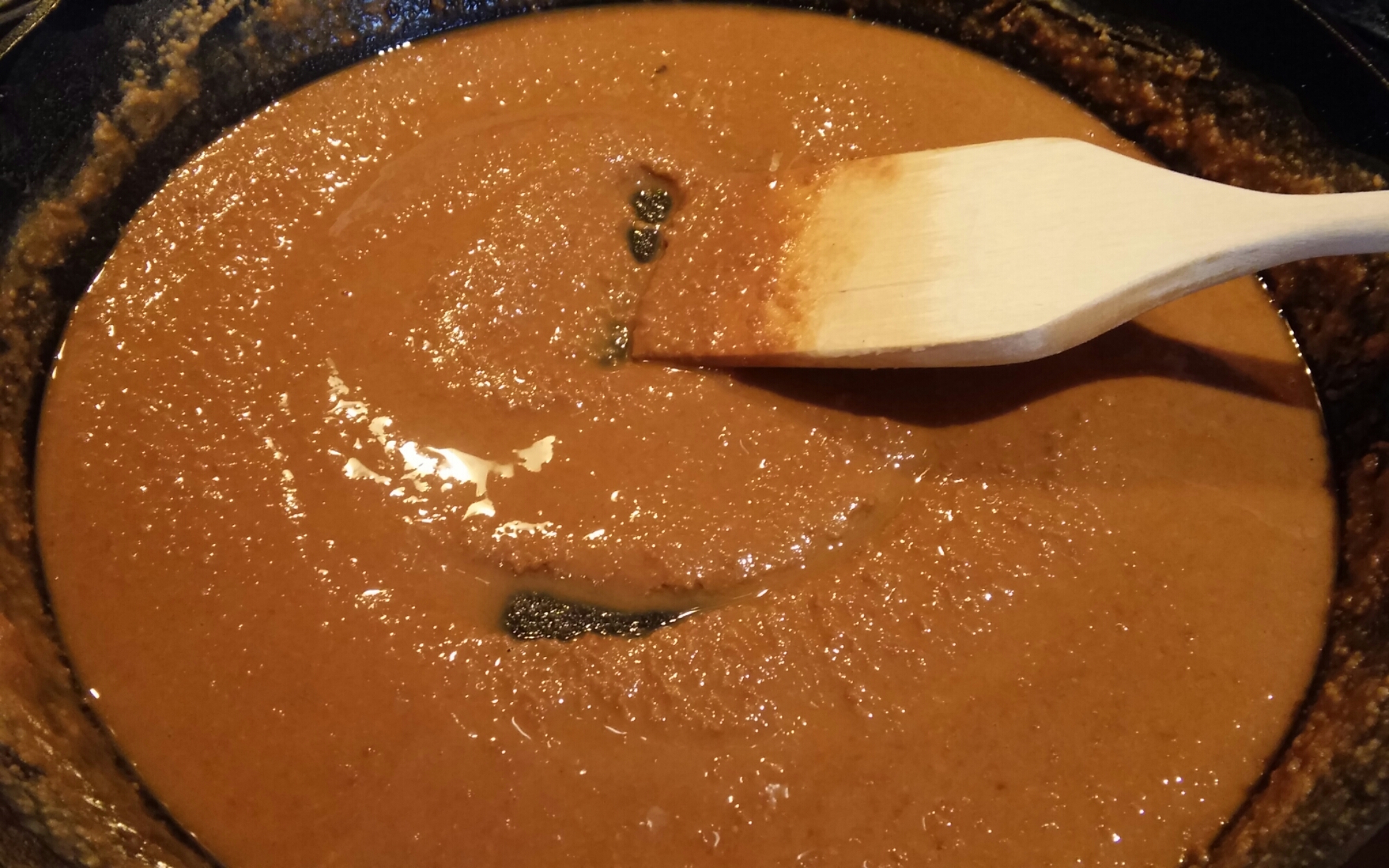 (😩you have to stand there and stir😩) This part takes patience–when it’s finished it should be as dark as chocolate and have a soft, “peanut butter” like consistency. Be careful not to let it burn! (If you see Black Spots forming its burnt and you have to start over) Feel free to add a little more flour or oil as needed to reach this consistency.
